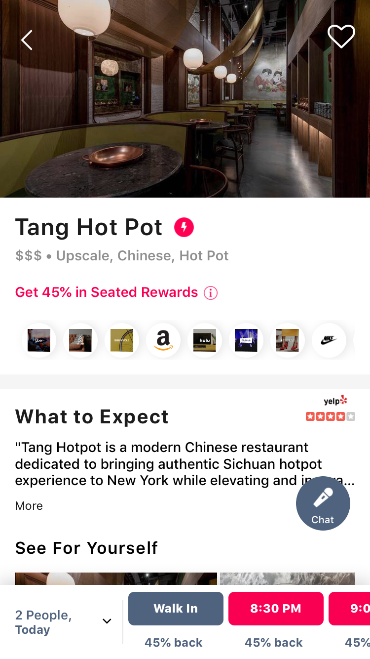除了网购返现,还有其他类型的返现哦!比如,如果你经常外出就餐的话,那一定要尝试一下餐厅返现APP Seated。使用Seated预约餐厅并前往就餐,之后将小票上传至Seated就可以获得返现。纽约目前有超过400家餐厅参加,比如99火锅、Neta等等,返现从5%-60%不等。小编现在使用过5次就已经返现$109了。每周一,还会有很多餐厅加大返现比例,来激励你的光顾。比如这周一,火锅店唐锅The Tang就有45%的返现!另外,新用户使用此链接注册还有额外$15奖励哦~